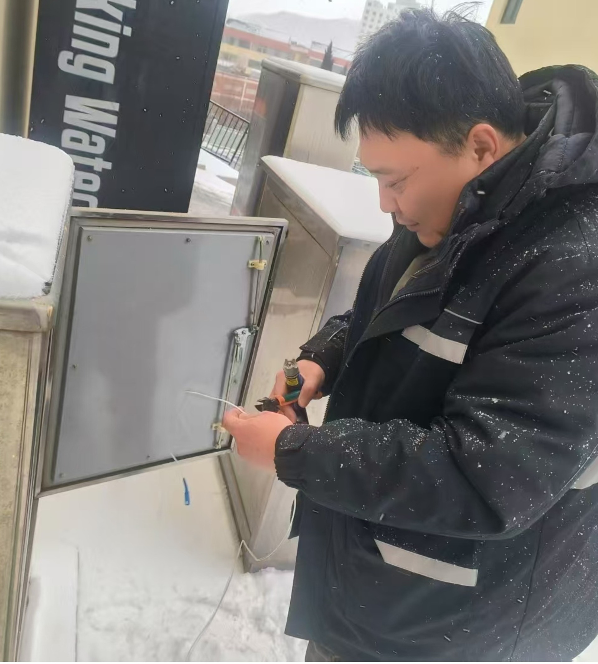 寒潮來襲,日照莒縣分公司始終堅(jiān)持客戶至上的服務(wù)理念,客戶經(jīng)理接到報(bào)修電話,第一時間趕到現(xiàn)場,進(jìn)行故障排查、信號恢復(fù),保障客戶收視與上網(wǎng)體驗(yàn)。圖為莒縣分公司直屬營業(yè)部客戶經(jīng)理王寶昊在桃園北區(qū)處理信號故障。